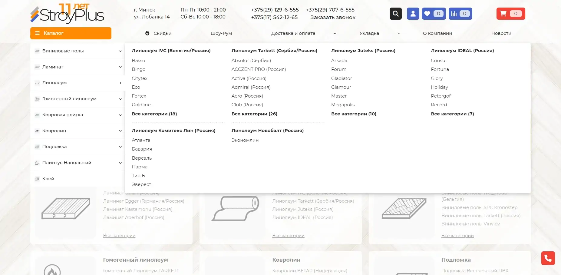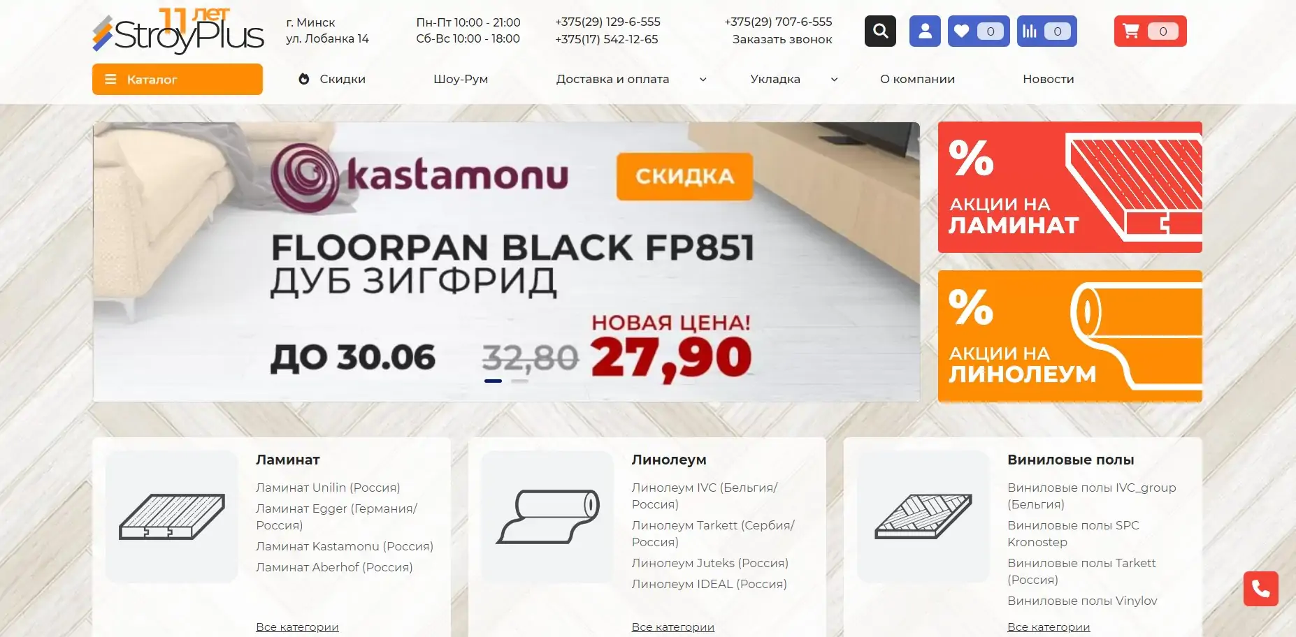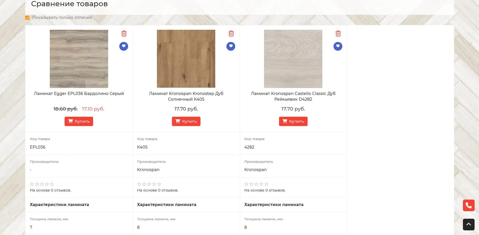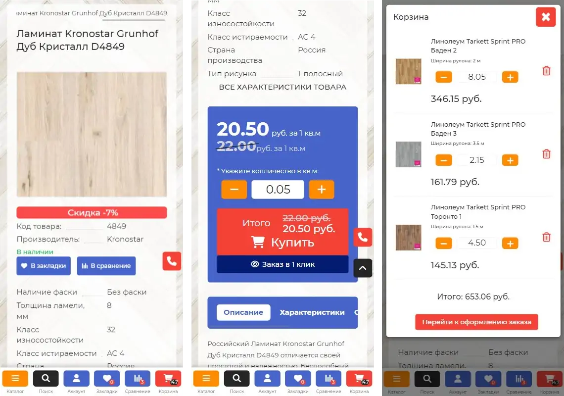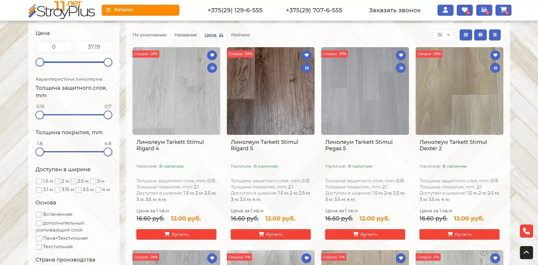 С правой стороны расположен Фильтр, который имеет массу настроек и функционала для SEO продвижения сайта. Через фильтр можно создавать отдельные посадочные страницы и скармливать их роботам для успешной индексации. В верхней части присутствуют различные кнопки сортировок и вариантов отображения товаров. На изображении карточек товара находятся кнопки "В закладки" "В сравнение". Если у товара есть опции обязательные для выбора, то при нажатии на кнопку купить, будет осуществлен переход в карточку товара для выбора опции. Если обязательных параметров нет, то товар будет добавлен в корзину в количестве 1 шт. далее количество можно дополнить в корзине. На сайте добавлена возможность указать минимально количество товара для заказа, например 0.05 кв.м или 1 шт. Так же эти данные показываются в блоке товара.