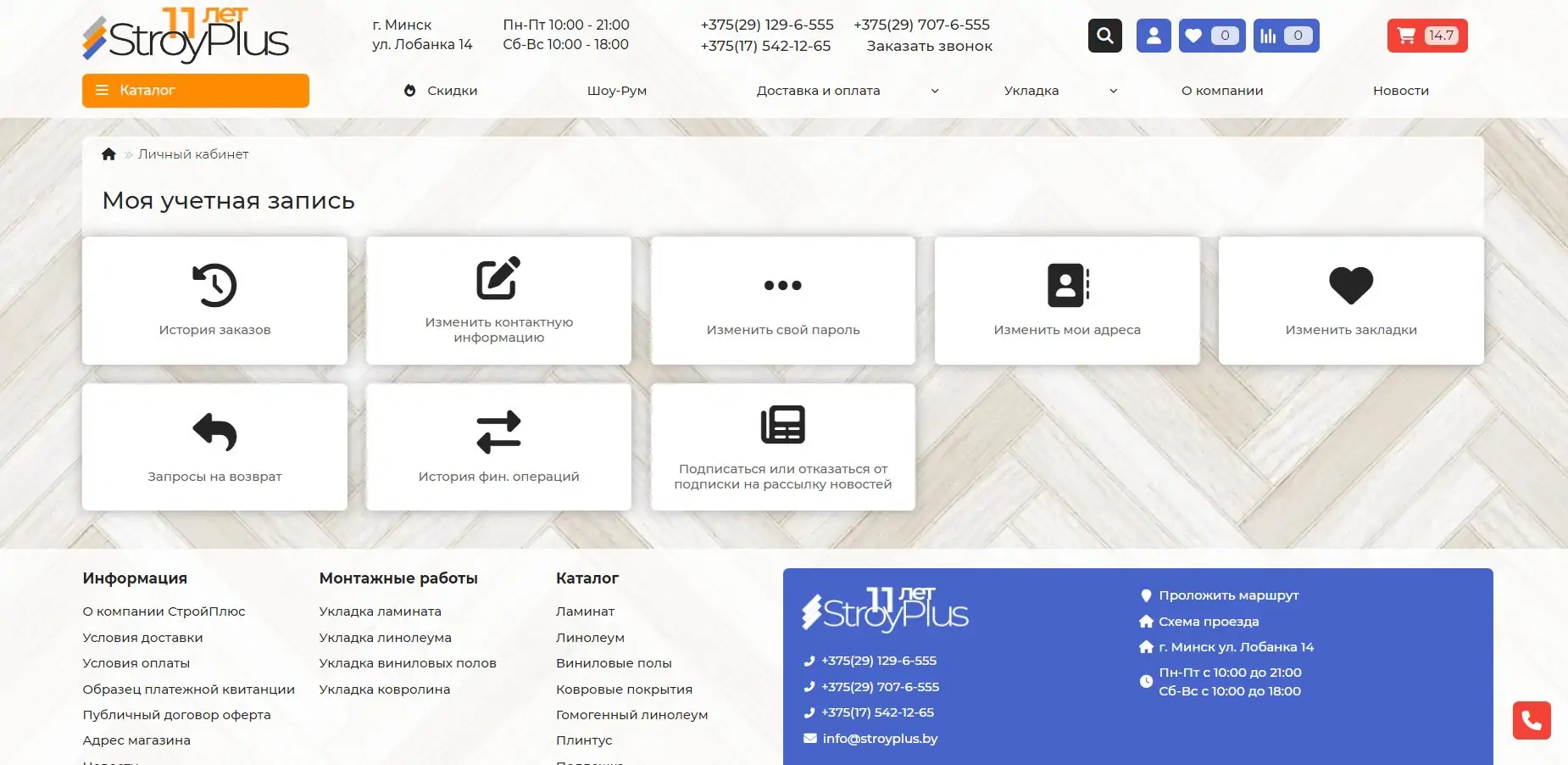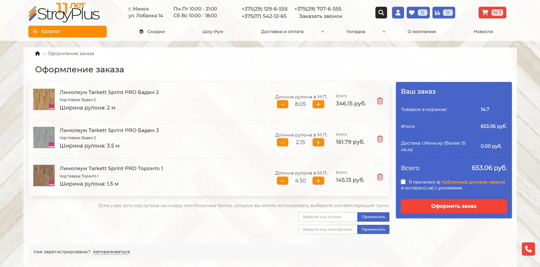 Корзина покупок имеет стандартный вид. В ней можно редактировать количество товара, удалять ненужные товары, выбирать адреса, способы оплат и доставок. Из не стандартного, для определенных регионов свои условия доставок. Например, в Витебске нет бесплатной доставки, так же отличаются способы и сроки доставки. Так же присутствует возможность ввести промо-код для получения скидки. Промо-коды задаются в админ панели сайта.