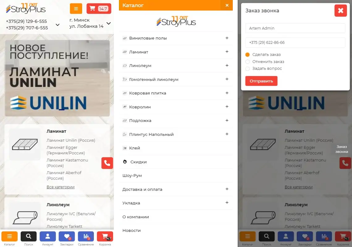 Отталкиваясь от того, что мобильный трафик по данному проекту достиг 80% от всех переходов, отдельно внимание уделили навигации по сайту и удобству пользования. В нижней части постоянно зафиксирован мобильный бар. Почти вся информация из шапки сайта перемещается в меню.