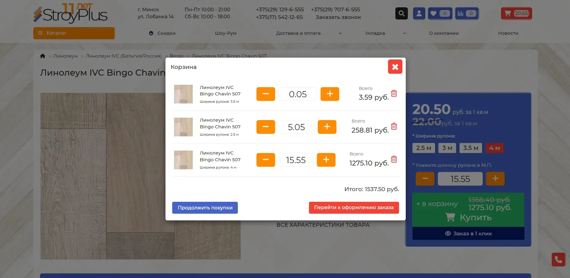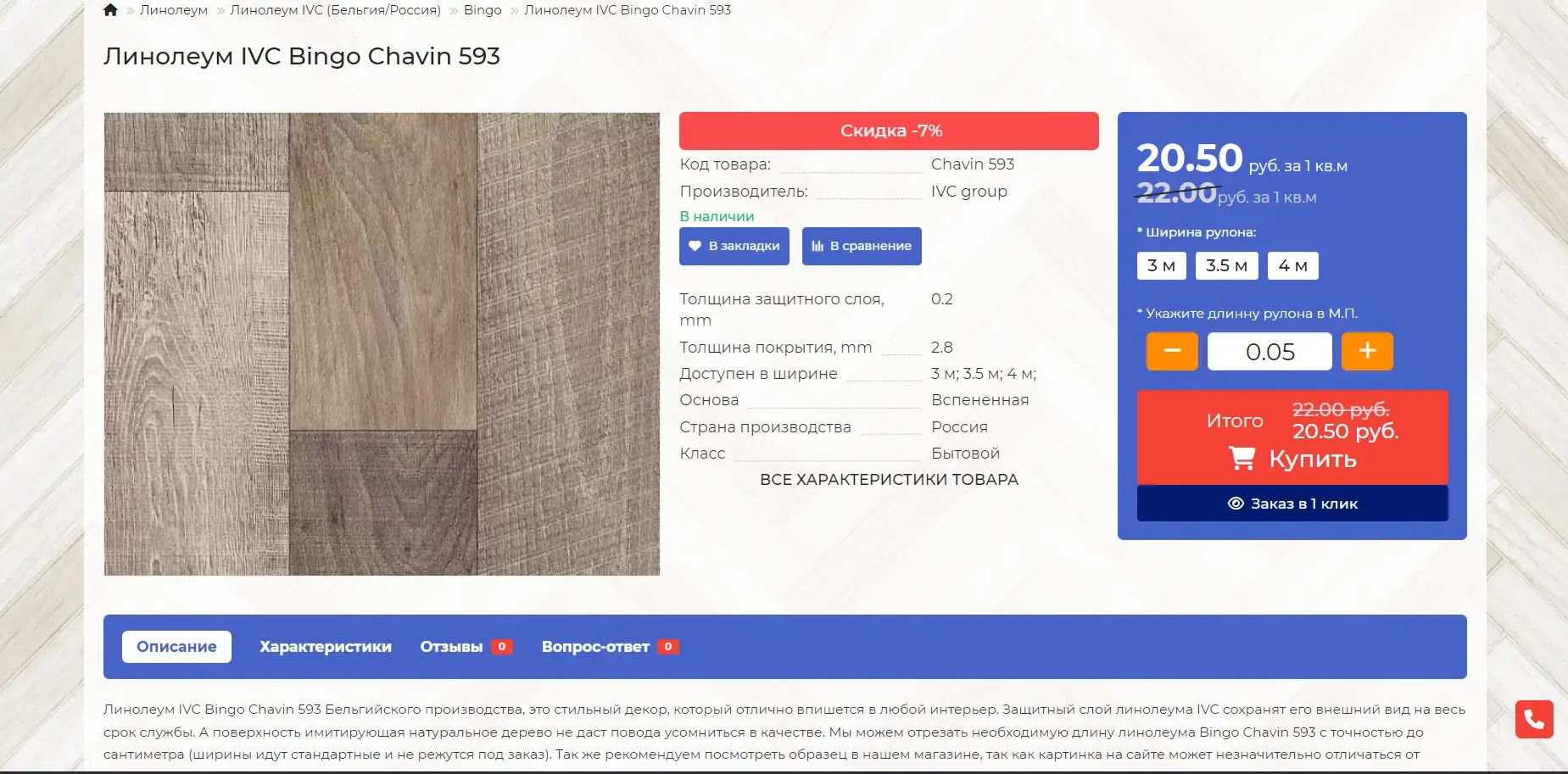 В карточке товара указана подробная информация по товару, характеристики, текст - описание. Так же есть блок заказа с мини калькулятором, который показывает сумму товара, так как товар мерный и может иметь различные размеры. При нажатии на фото, оно увеличивается на весь экран. Рядом с фото отображается скидка в % которая высчитывается автоматически при наличии скидочной цены. Так же можно добавить товар с список сравнения или в закладки соответствующими кнопками. Если у товара есть опции, например "Ширина" то она будет выводится в блок заказа.