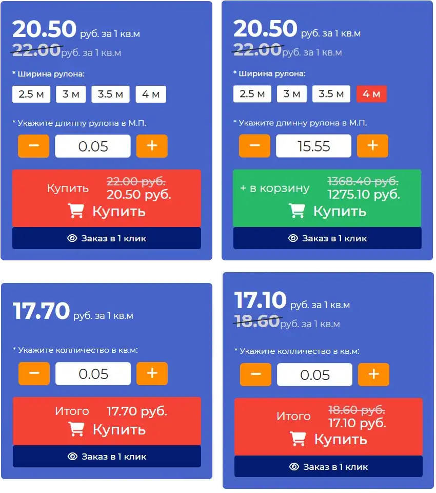 В блоке заказа в карточке товара есть несколько вариантов отображения. В данный блок подтягивается "Цена" "Цена со скидкой" при ее наличии. Так же Если у товара есть опции они тоже отобразятся здесь и будет подписано что именно за опцию нужно выбрать. Для товаров задается единица измерения, например кв.м, она так же отображается в этом блоке. В кнопку "Купить" встроен небольшой калькулятор для удобства пользователя. Если товар добавить в корзину, то кнопка "Купить" изменить свой цвет, сигнализируя о том, что товар уже добавлен в корзину. Если товар удалить из корзины, кнопка примет свой стандартный цвет.