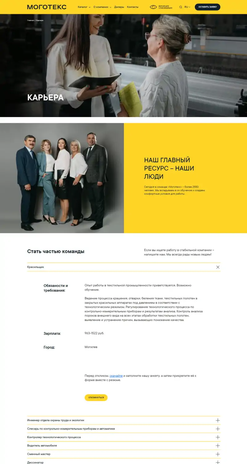 На сайте реализована страница вакансий. Разработан функционал самостоятельно размещения вакансий. Для соискателя предусмотрена возможность скачать резюме для конкретной вакансии и после заполнения отпривить резюме вместе с откликом на вакансию.