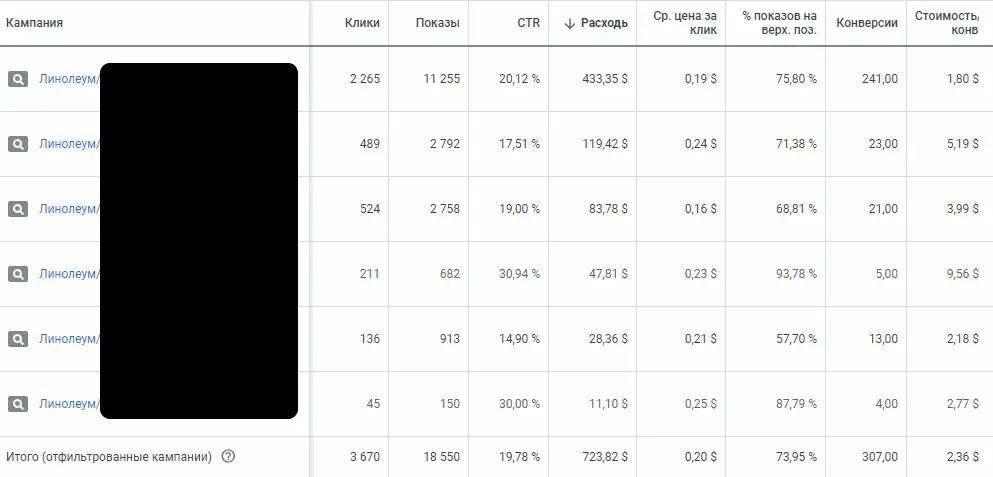 В Google: более 3,5 тысяч кликов и 18,5 тысяч показов (74% из которых приходились на верхний рекламный блок поисковой выдачи). Но самое главное – более 300 конверсий (где средняя цена конверсии 2,36$), из которых около 35% – реальная продажа.