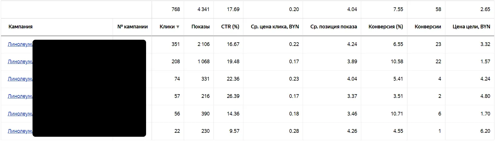В Яндексе: мы получили более 750 кликов и 4,3 тысяч показов (где также около 70% приходилось на верхний рекламный блок). 58 конверсий, при цене за конверсию – 2,65 BYN.