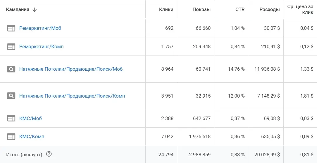 В целом, по всем рекламным кампаниям в Google Ads, за 24-хмесячный период мы получили: почти 25000 кликов, около 3 миллионов показов, со средней стоимостью клика 0,81$ (при этом эта цифра продолжает снижаться.