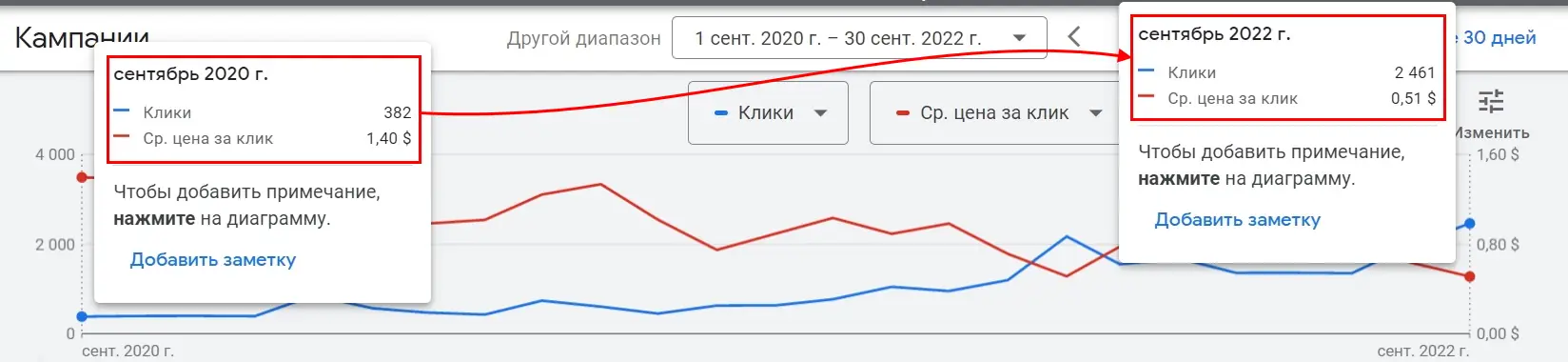 За сентябрь 2020 года в Google Ads мы получали менее 400 кликов при цене 1,40$ за один клик, в течении 2-х лет мы снижали эту стоимость и получали больше кликов, так за сентябрь 2022 года мы получили почти 2500 кликов, за 0,51$, более чем в 2,5 раза дешевле за каждый клик.