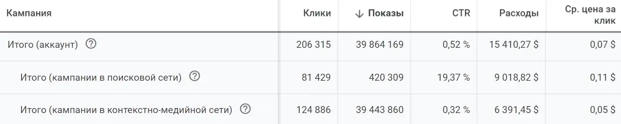 Со старта работ по проекту (май 2019) года в Google Ads мы получили более 205 тысяч кликов и почти 40 миллионов показов. Более 81 тысячи кликов из поиска, при средней цене клика 0,11$ и почти 125 тысяч из кампаний КМС и Ремаркетинга, при средней цене клика 0,05$.