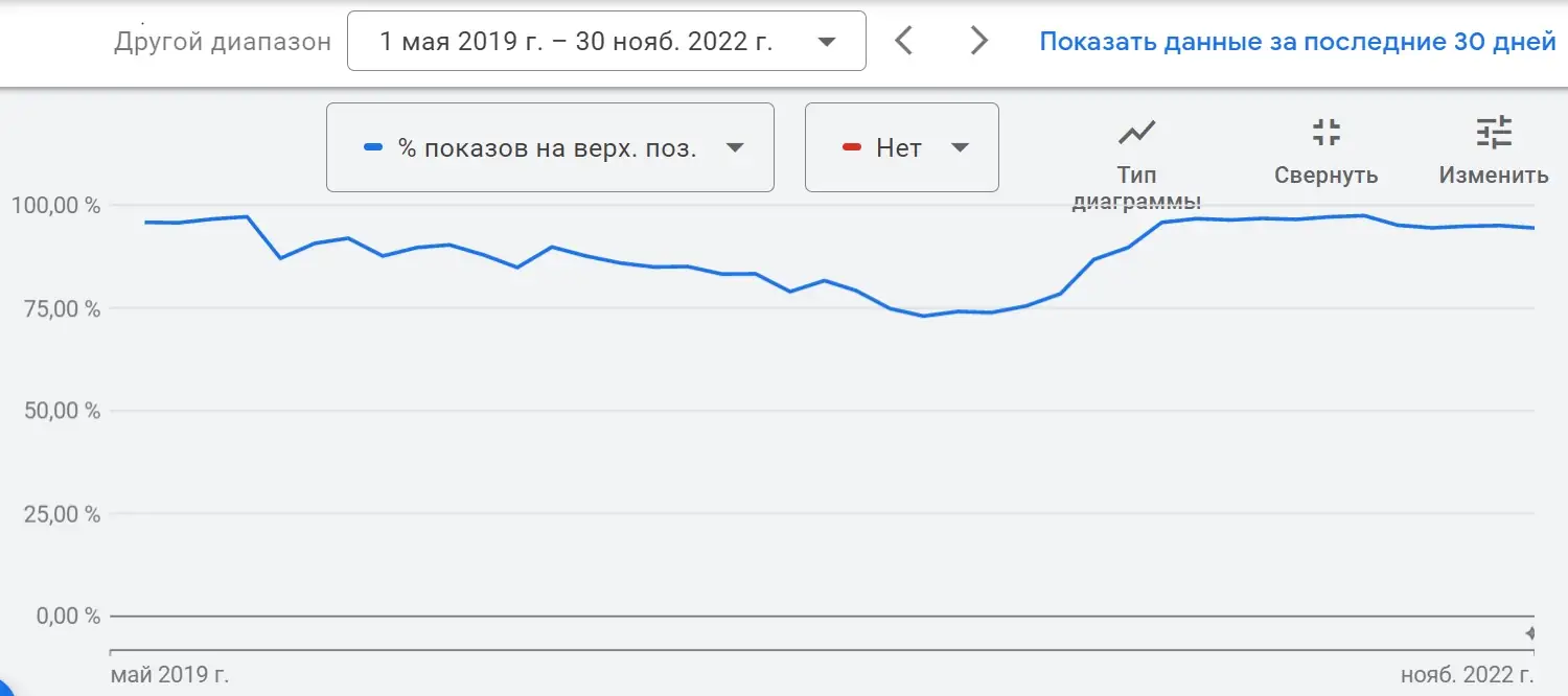 Процент показов в верхнем рекламном блоке на ноябрь 2022 года – около 95%.