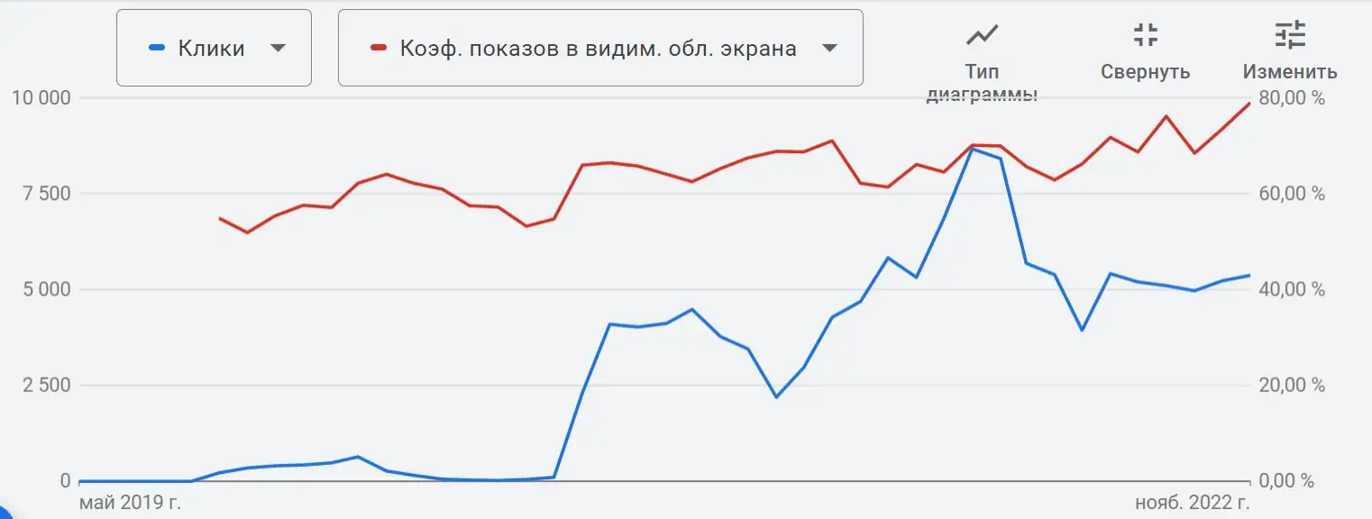 За ноябрь 2022 года мы получили 5400 кликов (0,05$ за клик), при этом объявления в 79% случаев показываются пользователю «на первом экране» его устройства.
