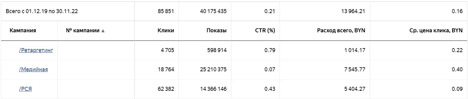 Результаты по Яндекс Директу (к сожалению, сервис позволяет выводить только последних 36 месяцев). За период с 01.12.2019 по 30.11.2022 мы получили более 85,5 тысяч кликов и более 40 миллионов показов, при средней цене клика 0,16 BYN.